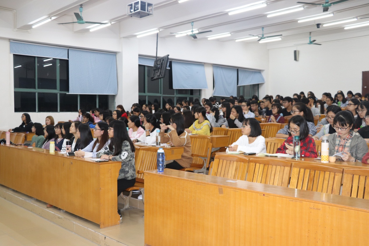 最后上台为新生们分享学习经验的是14级的李锦芳师姐,锦芳师姐曾经以全校最高分获得赴台湾公费学习的机会。她向全体新生分享了她的个人学习干货,她主张通过学生工作来提升自身的能力。她强调我们应以学习为本,不能本末倒置。“胆有多大,机会就有多大”、“文凭不是唯一的竞争力,能力也是竞争力”。锦芳师姐提醒新生们既要好好读书,也要好好生活,她认为活得快乐才是“王道”。最后,锦芳师姐发出自己的感慨:“大学四年转瞬即逝,且行且珍惜。”
