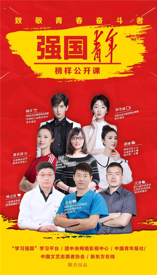 2020年五四青年节当天,《强国青年》榜样公开课预告片正式上线,节目通过讲述投身强国伟业的各领域青年奋斗者的故事,展现一批可亲、可敬、可信、可学的青春榜样,汇聚成一幅新时代中国青年的奋进群像,引导广大青年争做“爱国、励志、求真、力行”的时代新人。