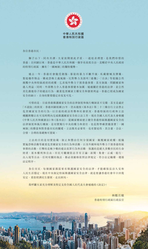 香港是中国的香港,香港事务是中国的内政,700多万香港市民是14亿中国人民的一分子,在香港维护国家安全理所应当。香港国安立法,中央诚意十足,特区责任重大。我们有理由相信,有中央的坚定支持,有国安法的坚强守护,有特区政府的矢志努力,有香港市民的坚心力撑,香港一定能战胜风浪、迎接更好明天。
