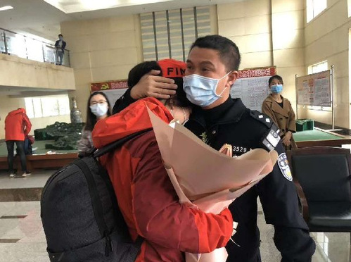2月15日上午11时,清远市阳山举行援助湖北医疗队出征仪式。身为民警的成运来来不及换下执警服便匆忙往卫生院跑,看到手捧鲜花准备上车前往湖北抗疫的妻子杨洁萍,急忙跑过去,一把抱住妻子紧紧地搂进怀里,哽咽着久久说不出话来,千言万语就在这一个拥抱之中。