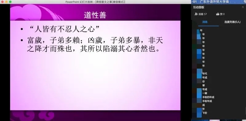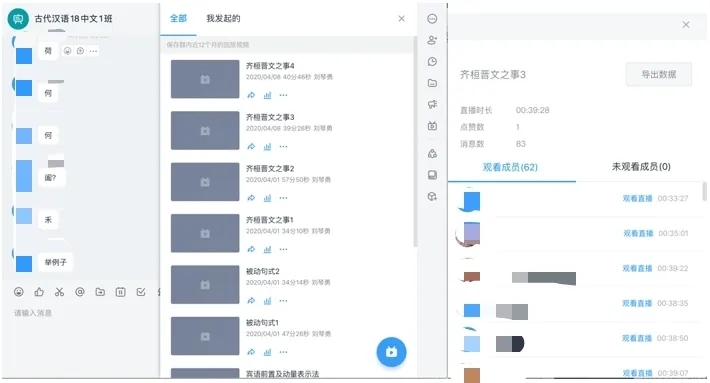 《古代汉语》线上课堂教学主要采用钉钉。钉钉群直播以及视频会议模式功能齐全,可以根据教学需求进行选择。群直播存在互动不够流畅、网络延迟的问题,但学生可以通过主动发出连麦请求来回答问题,也可以在互动面板直接发表自己的看法,这一功能在直播时用得最多。
