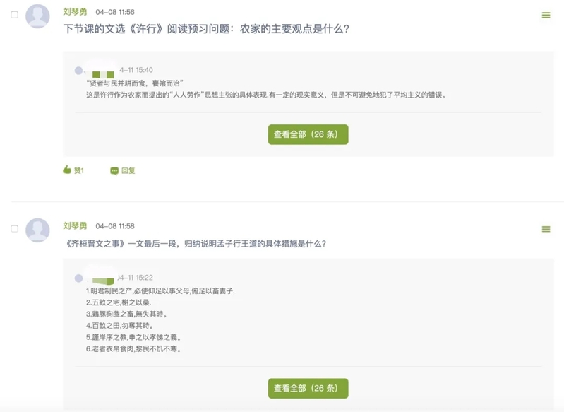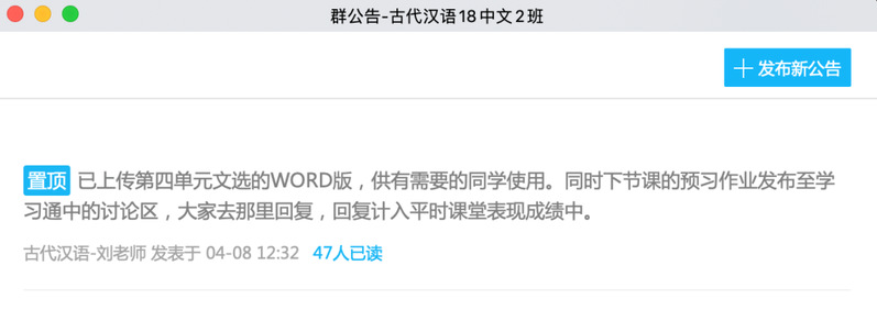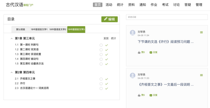 根据学校推荐的在线教学平台,古代汉语课主要通过超星学习通发布课程学习资源,如授课PPT、教学内容、教学要点和相关拓展资源,以及组织线上讨论,开展课前预习并发布作业、测试等。同时,还可以通过本班QQ群发布公告、推送信息、在线答疑,营造热烈的学习氛围。