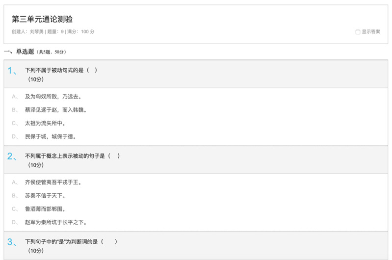 在讲述了本学期重点通论知识后安排测试,如双宾语、宾语前置、被动句、动量表示法以及词类活动系统讲授完了之后,统一安排测试,主要作用是帮助学生再次梳理近期学习的重点知识,使学生及时查漏补缺,对重点内容进行消化与吸收。
