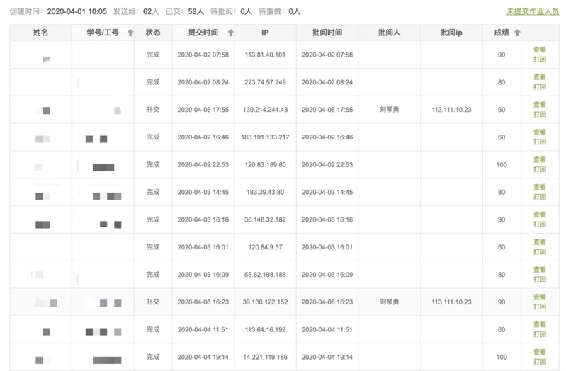 针对学生学习在线直播课程时,学习专注度和学习的效果无法直接观察,同时也为了督促学生自觉并且及时巩固复习,吸引学生的注意力,在每一次课程结束后,都将作业发布在学习通上,通过作业的反馈及时了解学生对该知识点的掌握情况。学生提交作业并由教师评阅后,可以查看答案,对于成绩不理想的学生可以打回重做,在写作业的过程中,督促学生思考存在的问题,学生与教师的课后交流变得更频繁。