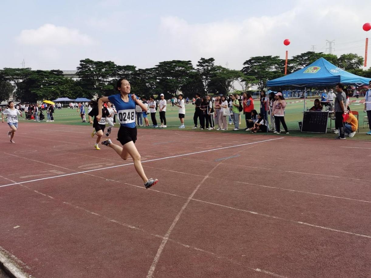 比赛开始前,选手们在主席台左侧热身准备着,他们精神饱满,意气风发。王怡珺同学在开跑前还比了个加油手势,为自己打气。各位参赛选手们实力相当,向前奔跑的步伐稳健有力。最后,在观众的加油声和欢呼声中选手们奋力冲向终点。