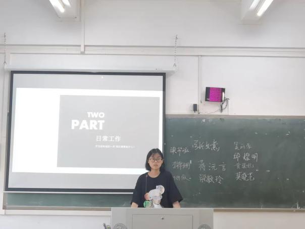 在会议正式开始前,会议主讲人蔡心文和黄林凤先行上台自我介绍,并提出了对本学期资料组工作的可行性要求。指导人许嘉欣在发言中特别提醒组员们在日后工作时要细心认真,尤其在进行党务系统的录入工作时,更需要留意工作细节。