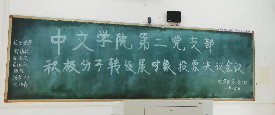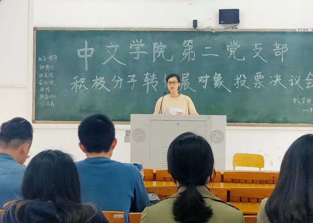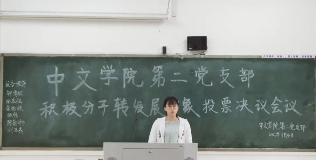 本支部讯(记者/陈智敏 摄影/邓诗敏)2021年3月4日下午,中国语言文化学院第二党支部于A203顺利召开了入党积极分子转发展对象投票决议会议。中国语言文化学院第二党支部18名正式党员与25名预备党员出席此次会议,有表决权的党员出席人数达半数以上,投票决议会议正式召开。会议由梁华泓同志主持,共分为积极分子进行思想汇报、培养联系人发言与党员无记名投票三个环节。