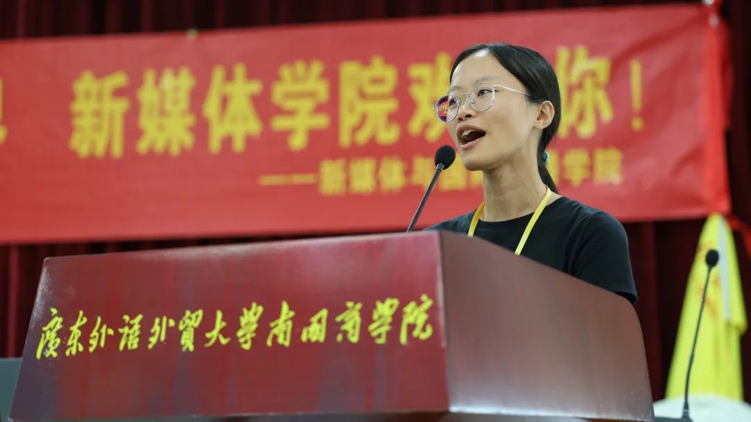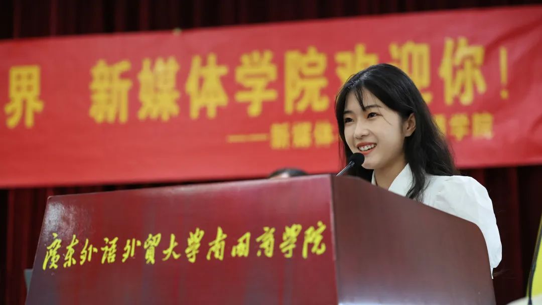 2020级网络与新媒体专业葛楷力作为学生代表发言,“新媒体学院现在作为广外南国最富有生机的学院之一,正在不断地努力完善。而我们就是实践的参与者和行动者,在大学四年中我们要学会如何做人,通过不断地实际操作,不断巩固,不断创作最终让自己成为一名优秀的新媒体人”。