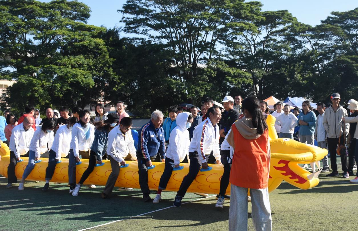 11月26日上午,我院教工组趣味项目赛龙夺锦在运动场举行。赛龙夺锦这项比赛需10名教师同时骑在充气长龙上,抓住对应手柄,大步迈向终点。大部分参赛老师都是初次参与此项活动,但他们都从容面对。比赛在欢声笑语顺利完成。
