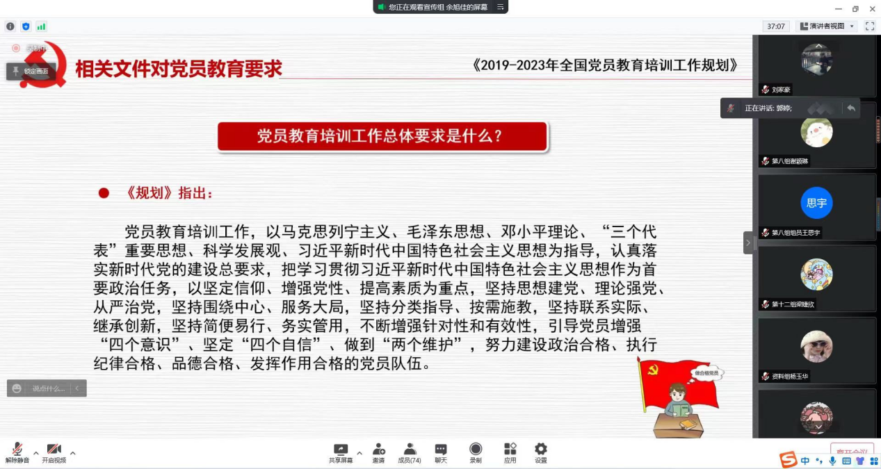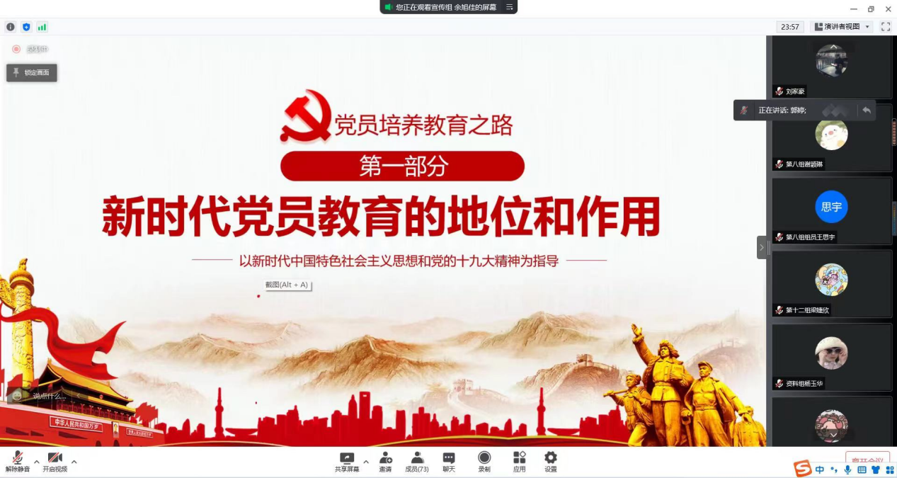 本次会议由郭婷书记主讲开展,会议分为四部分。首先郭书记主要从历史未来贯通、理论实践相联系、经验教训相对比的角度讲述了新时代党员教育的地位和作用。