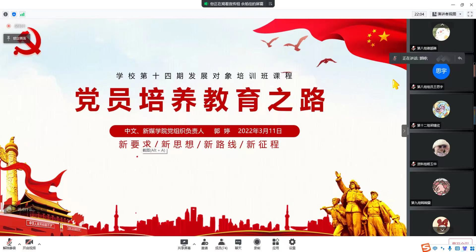 本支部讯 2022年3月11日中午,为增进支部成员对党员培养教育的认识,新媒体与国际传播学院直属党支部组织开展了线上会议。新媒体与国际传播学院直属党支部书记郭婷、第十四期发展对象培训班全体成员参与本次课程。