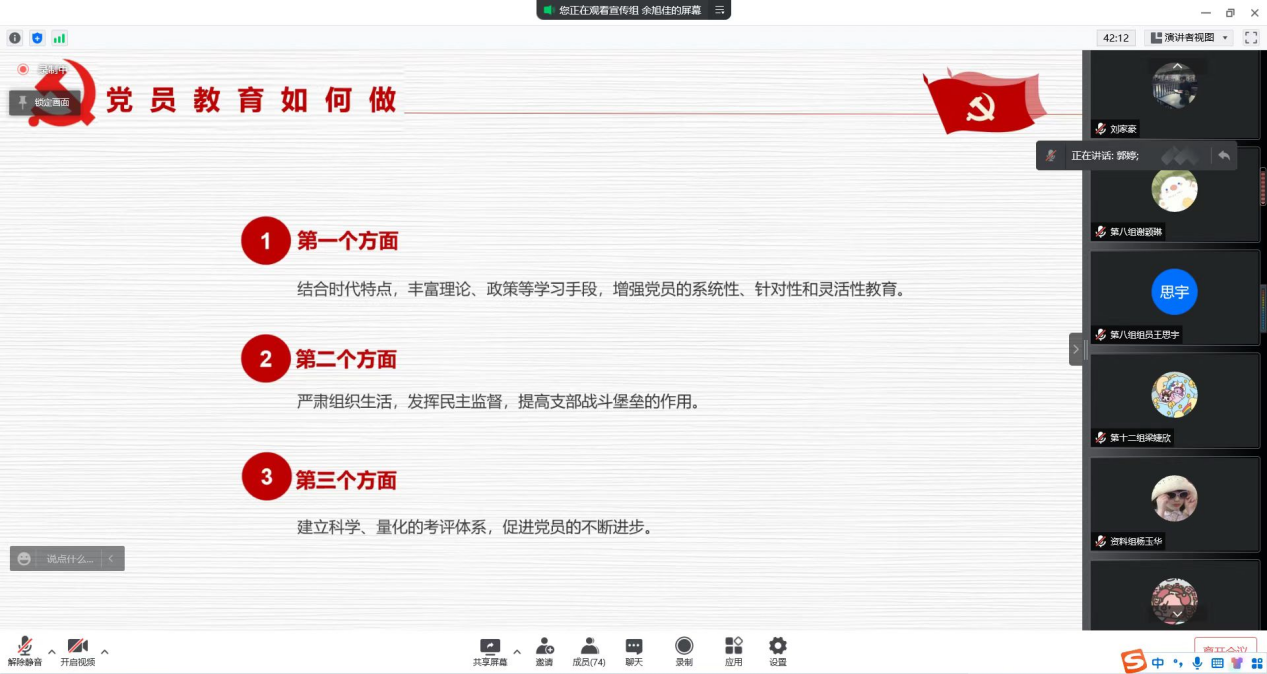 郭婷书记强调党员教育之路应当坚持以习近平新时代中国特色社会主义思想和党的十九大精神为指导,要求党组织应在全面规划和制度上做保障,在组织形式和创新上下功夫,在理论联系实际的党性锻炼上真抓实干;要求党小组成员要积极参加各项训练,自觉接受教育和学习理论知识、并投入到各项实践锻炼中去。
