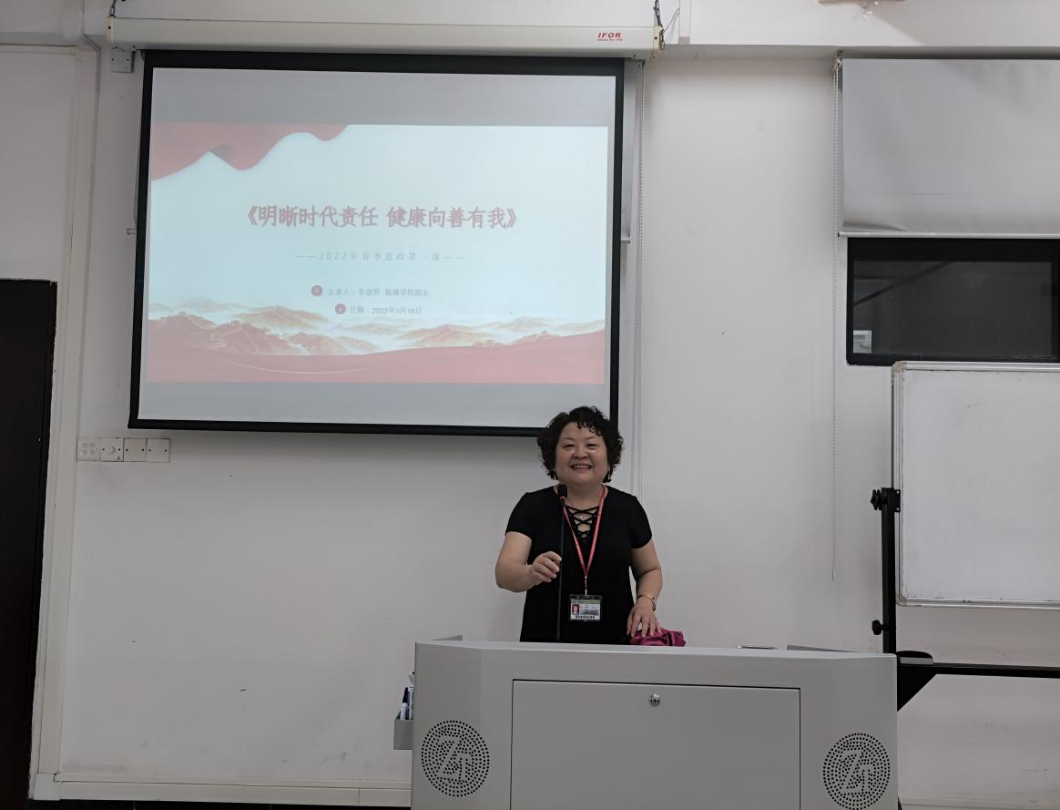 3月16日上午,新媒体学院院长李淑芳在教学楼G302课室为2021级学生授课,授课主题为《明晰时代责任 健康向善有我》。