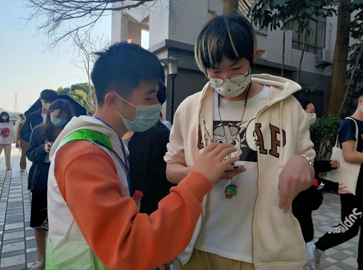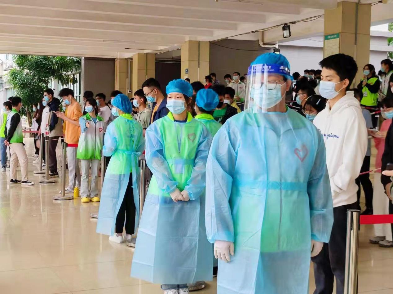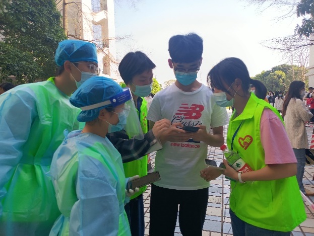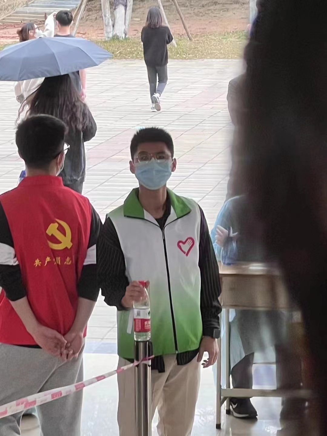 来着中文学院21汉语言文学2班的吴港锋同学,积极配合学校工作的安排,以志愿者身份投入三天两检的工作中,帮助展开核酸检测工作。感谢像吴同学这样在背后默默无闻的乐于奉献的同学。