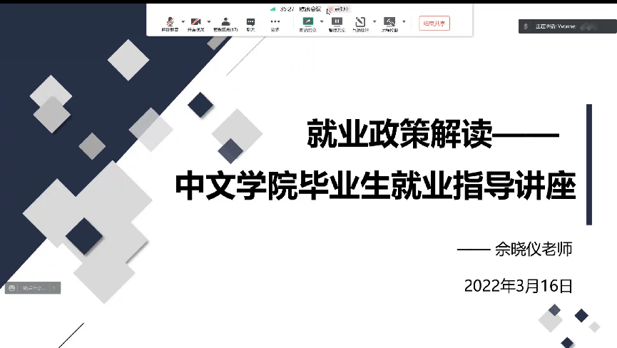 3月16日晚,我院召开了以“就业政策解读”为主题的中院毕业生就业指导讲座,邀请了学校招生就业指导处佘晓仪老师为主讲人。