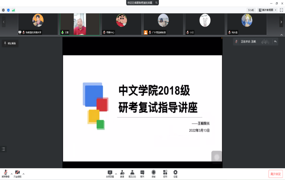 3月13日晚,中文学院为21届研考考生进行复试指导,与会同学包括18级即将参加考研复试及19级拟参加2022年研究生考试的考生。此次讲座由中国语言文化学院王毅院长主讲、由党总支郭婷书记主持,毕业生辅导员梁秋燕老师出席本次讲座。