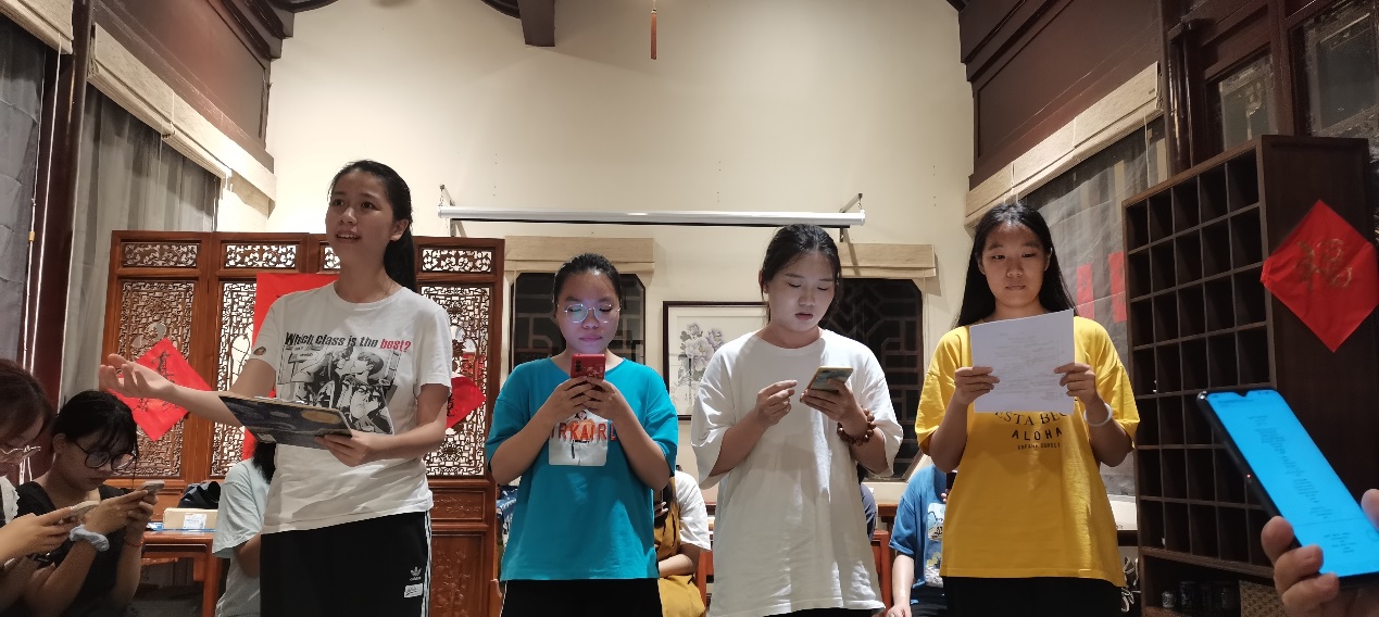 活动开始,王毅院长让每个小分队一个接一个进行朗诵,再分别指出每个小分队存在的不足之处,并亲自示范应如何去朗诵,比如开头部分,起始不要快、朗诵过程要专心致志,不要笑场、结尾部分应沉稳等。