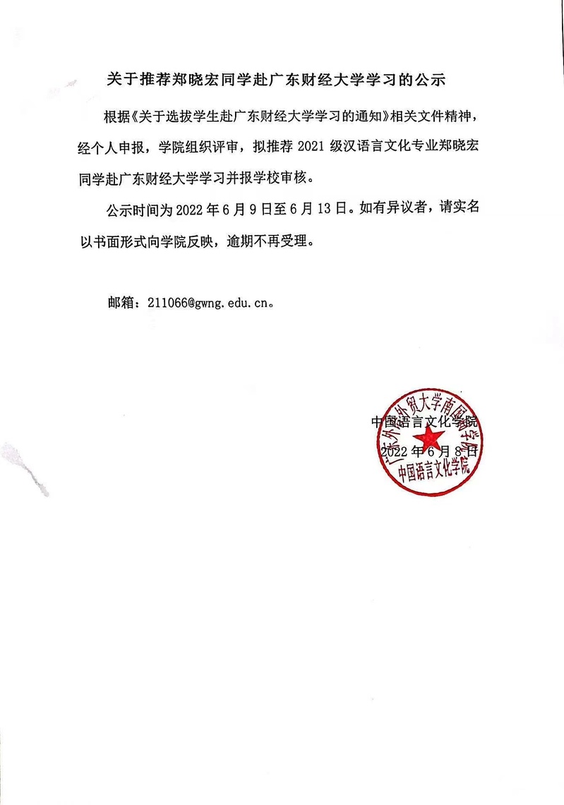根据《关于选拔学生赴广东财经大学学习的通知》相关文件精神,经个人申报,学院组织评审,拟推荐 2021 级汉语言文化专业郑晓宏同学赴广东财经大学学习并报学校审核。