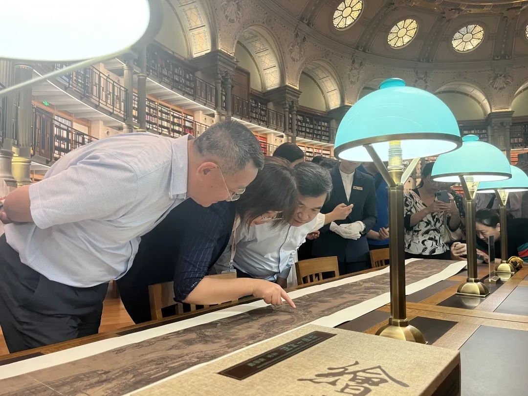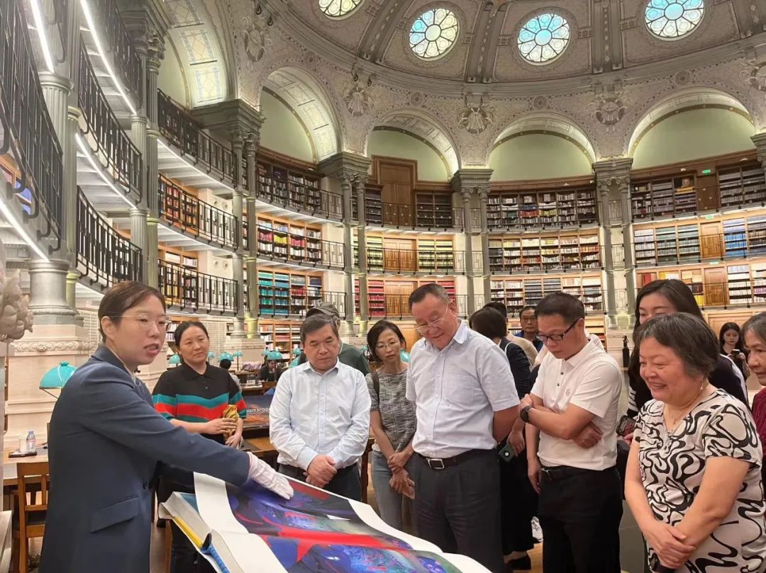 跟随讲解员的介绍,教师们一行移步换景,了解图书馆的结构、建筑构造材料、独特的匠心设计、装饰元素和功能划分,馆内藏书十分丰富,总共有11万册书籍,其中4万册英文书籍,7万册中文书籍,教师们一齐领略了馆内由青岛出版社全球限量发行100册的《中国传世书画经典百部》的绘画编之《清明上河图》、全球限量发行9000册的英国最具影响力的艺术大师大卫·霍克尼的超大开本的作品集《A Bigger Book》等“镇馆之宝”。