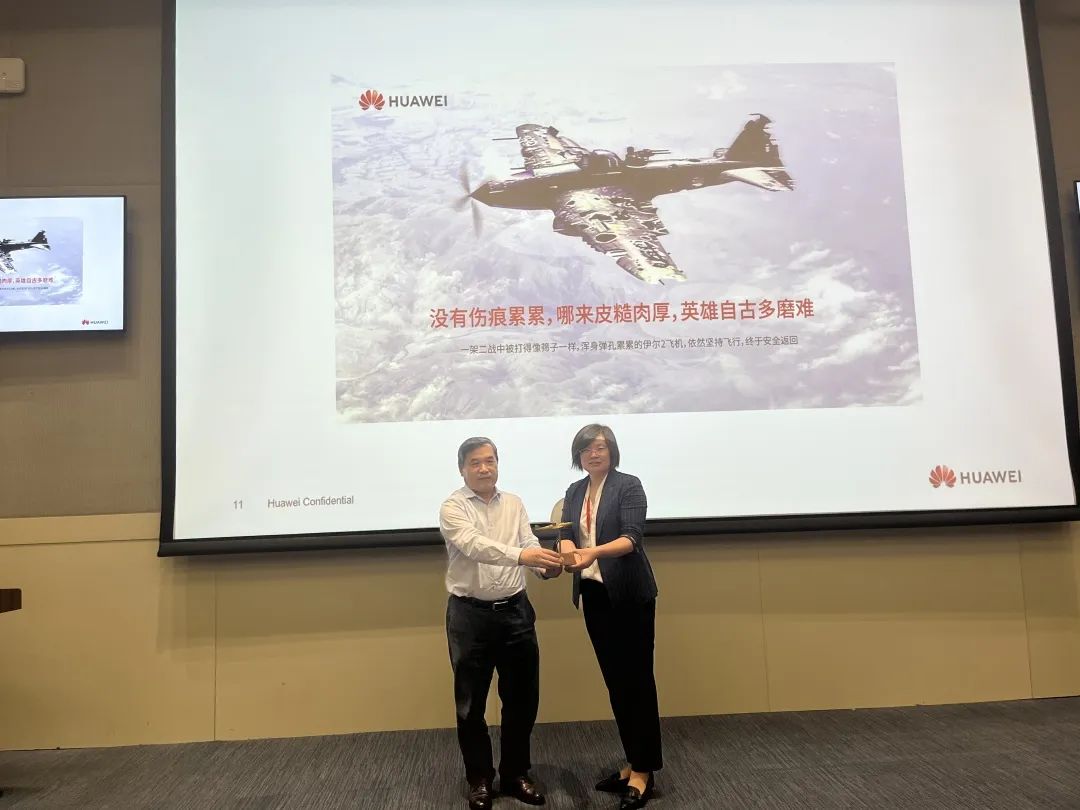 会上,陈芳女士为学校焦方太校长送上一份纪念品——伊尔2退伍战斗机模型。华为创始人任正非曾说:“没有伤痕累累,哪来皮糙肉厚 ,英雄自古多磨难。”2020年,华为公司面对美国的全面限制,华为以这架战斗机自喻。