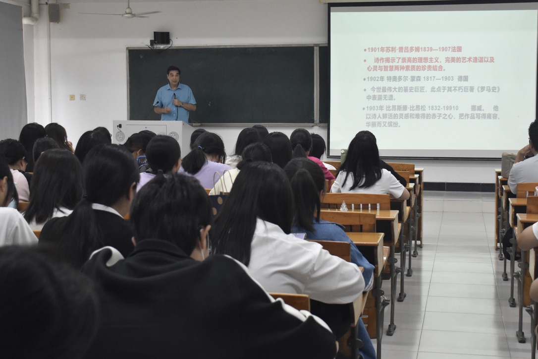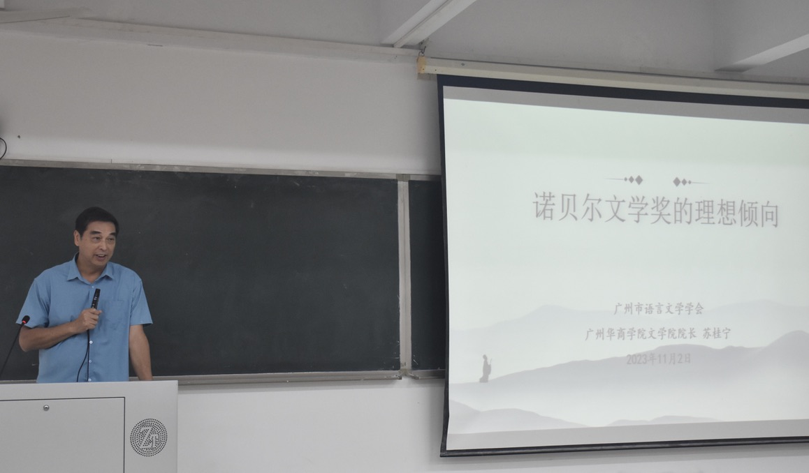 本网讯 为拓宽学生的文学视野,同时让同学们深入理解人类情感、社会问题以及人生意义,2023年11月2日下午3点半,我院特邀广州华商学院文学院院长苏桂宁教授在G401为同学们举办了主题为“诺贝尔文学奖的理想倾向”的学术讲座,出席本次讲座成员有吴晟副院长、李明杰老师以及中文学院的部分同学。