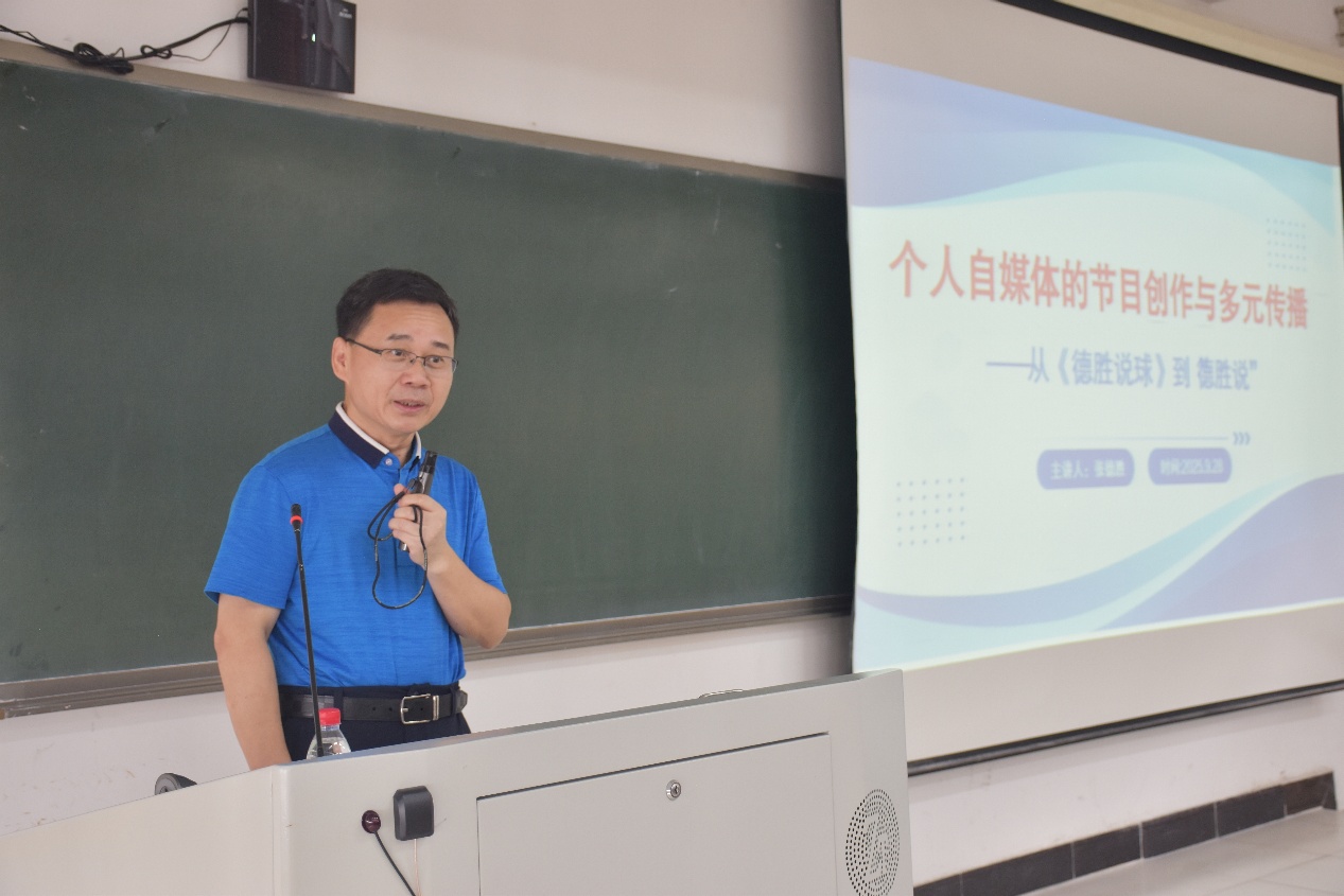 讲座中,张德胜教授以个人运营的“德胜说球”自媒体为例,系统分享了从内容创作到多元传播的全流程与核心经验。他通过解析师生共创模式、复盘抖音运营策略,并阐释“脚步到,学问到”的实践箴言,为文传学院的学子们提供了一套行之有效的创作方法论。