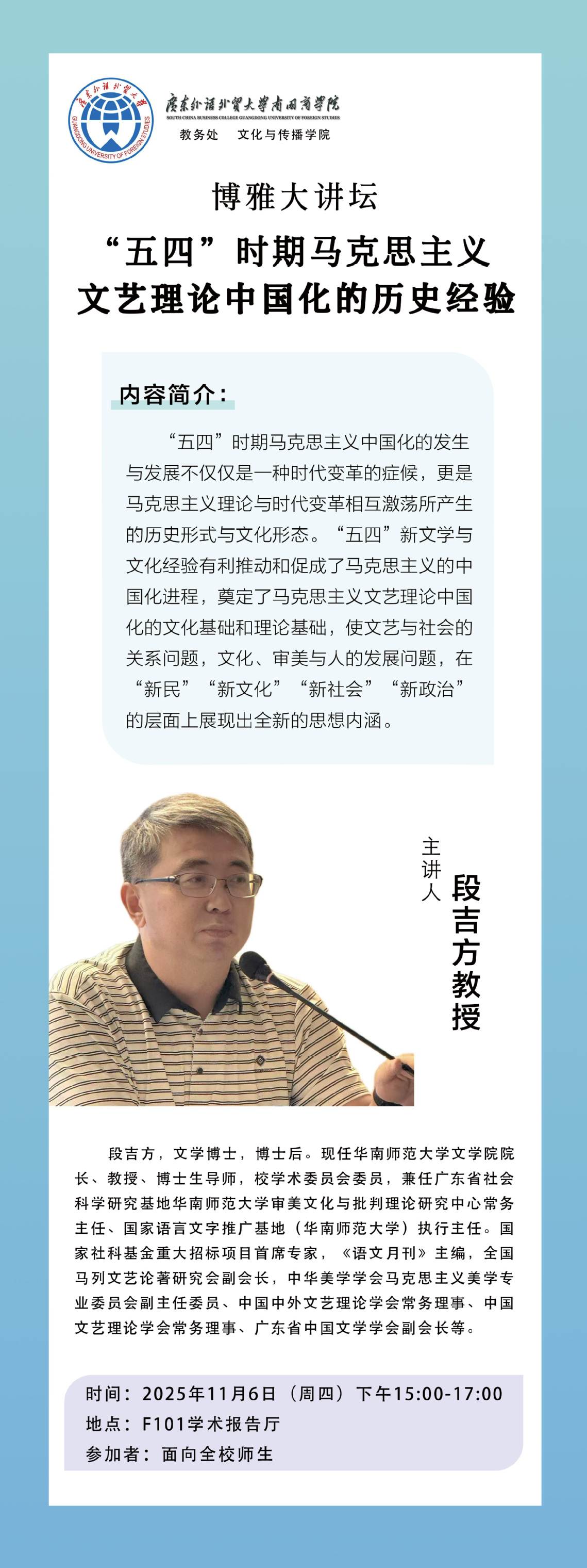 主讲人:段吉方,文学博士,博士后。现任华南师范大学文学院院长、教授、博士生导师,校学术委员会委员,兼任广东省社会科学研究基地华南师范大学审美文化与批判理论研究中心常务主任、国家语言文字推广基地(华南师范大学)执行主任。国家社科基金重大招标项目首席专家,《语文月刊》主编,全国马列文艺论著研究会副会长,中华美学学会马克思主义美学专业委员会副主任委员、中国中外文艺理论学会常务理事、中国文艺理论学会常务理事、广东省中国文学学会副会长等。