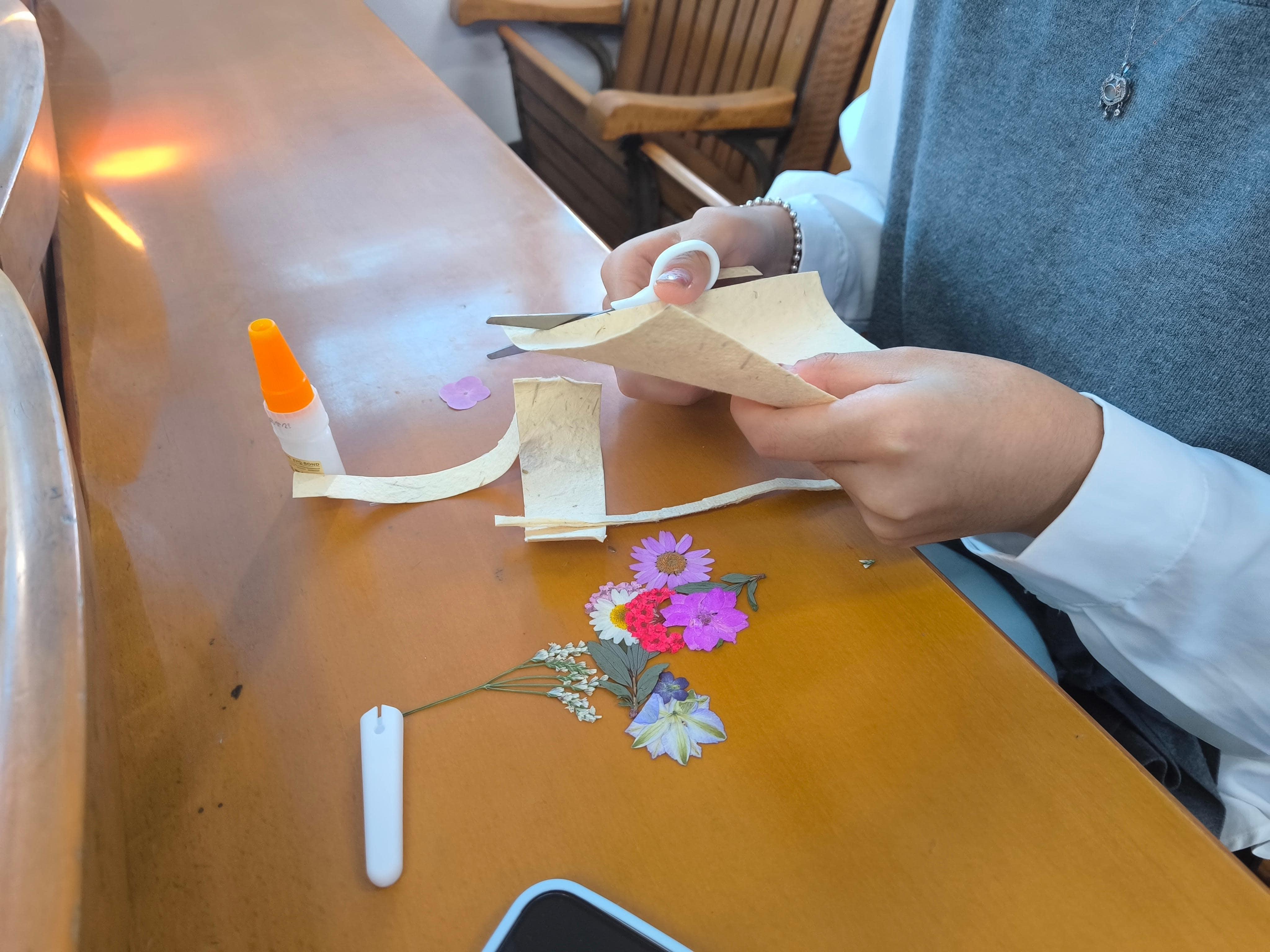 在制作环节开启后,同学们纷纷挑选花材,裁剪卡纸,将片片花瓣与枝叶重新组合,赋予自然以新的生命。现场氛围静谧而专注,指尖的每一次触碰,都是与自我情绪的温柔对话。同学们自由搭配色彩、构图,或选择暖色调传递治愈感,或通过撞色展现灵动创意。每一幅作品都承载着独特的情感,成为参与者内心世界的生动映照。