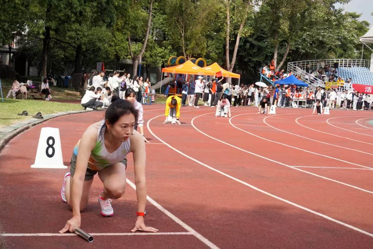 当发令枪的硝烟取代了粉笔的尘埃,当塑胶跑道替代了三尺讲台。11月14日上午,一年一度的校运会迎来了它最具反差魅力的高潮——教工组混合接力4*100比赛。这不仅是速度的角逐,更是一场属于全体师生的、充满温情与趣味的欢乐盛宴。 平日里温文尔雅的老师们,此刻在起跑线前凝神屏息、反复调整起跑姿势,这种角色转换的新奇感瞬间点燃全场热情。