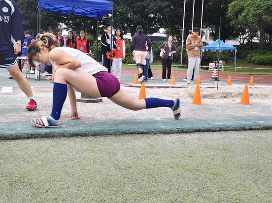 选手宋乐儿同样进入备战节奏,在助跑线处蓄势待发。她双目紧锁前方沙坑,双臂随步伐快速摆动,凭借身体惯性的冲刺力腾空而起,双脚利落点地,完成了一次舒展而流畅的试跳。