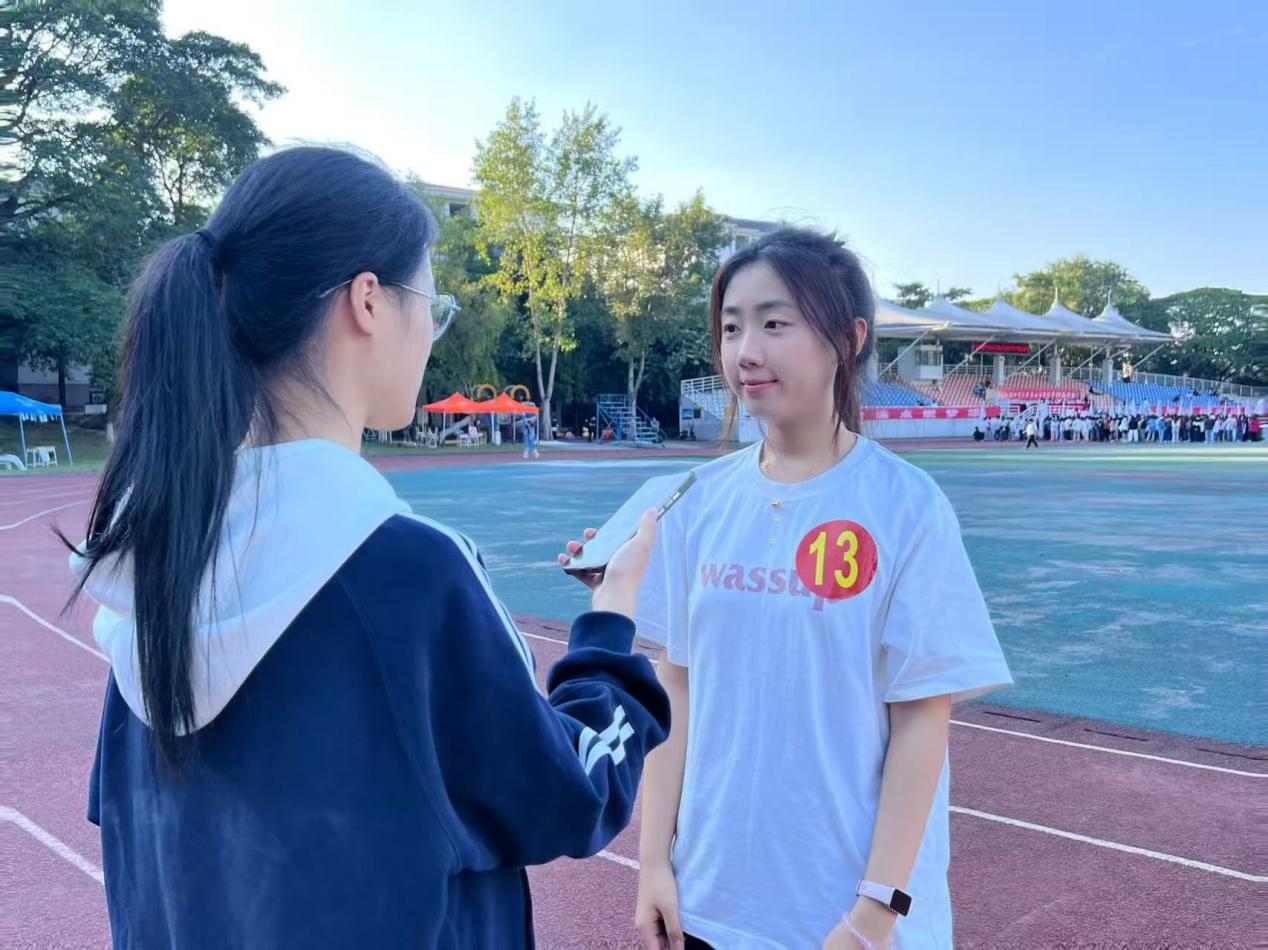 赛后,林祉昀同学接受了记者的采访,她表示,夺冠后心情十分开心,没想到能跑那么快,因为赛前大家都没有进行针对性的训练过,刚接棒时有些紧张,但由于前面的队友已建立起较大领先优势,后续就比较从容了。她还表示,团队比赛有很多人给予支持和鼓励,会让自己更有信心,也让她感受到文传学子团结协作,奋勇拼搏的精神。