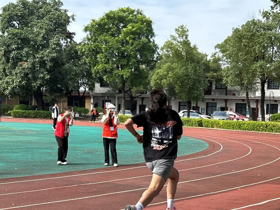 随着发令枪清脆作响,邓雅琪瞬间弹射而出,起跑动作干净利落。她身姿挺拔,步频轻快稳健,每一步都精准踏在发力点上,长发随奔跑惯性向后扬起,如一道灵动风景线划破赛场。赛道旁,师生们的呐喊助威声此起彼伏,邓雅琪目光坚定锁定终点,双臂有力摆动,脚下步伐愈发急促却不失章法。两百米征程在全力冲刺中飞速缩短,她迎着阳光、逆着微风,将全身力量汇聚于双腿,带着不服输的韧劲奋勇向前,最终奋力冲过终点线,用尽全力赛出青春风采。