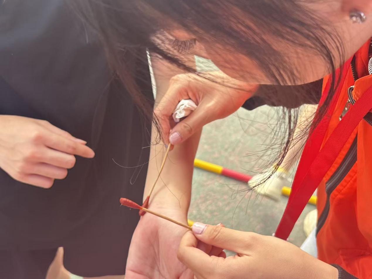 挑战升级至1.20米,何盈凝、张艺娜成功晋级。随即来到 1.22 米 —— 这个高度在日常生活中不算高,但在跳高比赛中却是一道不小的门槛。何盈凝选手为此来到场地一旁练习,不慎摔伤了手臂,一旁的志愿者和好友纷纷上前为她清洗伤口、消毒。贴好创口贴,她急忙赶去参加比赛,带着关切,她顺利跃过!张艺娜选手虽未晋级,她轻盈的身姿仍给观众们留下深刻印象.