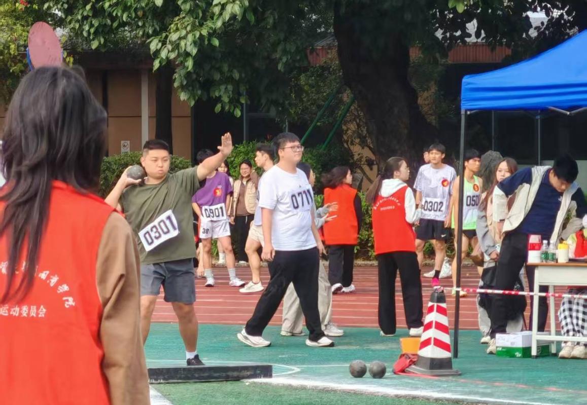 11月14日上午,男子铅球决赛顺利举行。现场的选手们饱含着热情与期待。我院的选手解博宁积极热身准备迎接即将到来的比赛。