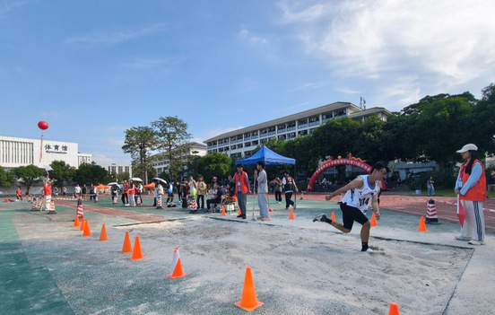 11月14号下午两点,紧张刺激的男子三级跳比赛在运动场的沙滩上顺利举行,在阳光的照耀下,选手们在沙滩旁进行热身运动,每个人都饱含精神认真做着拉伸,对于比赛表现得非常积极,我院的郑创钦同学在烈阳下时刻准备爆发力量,一举夺冠。