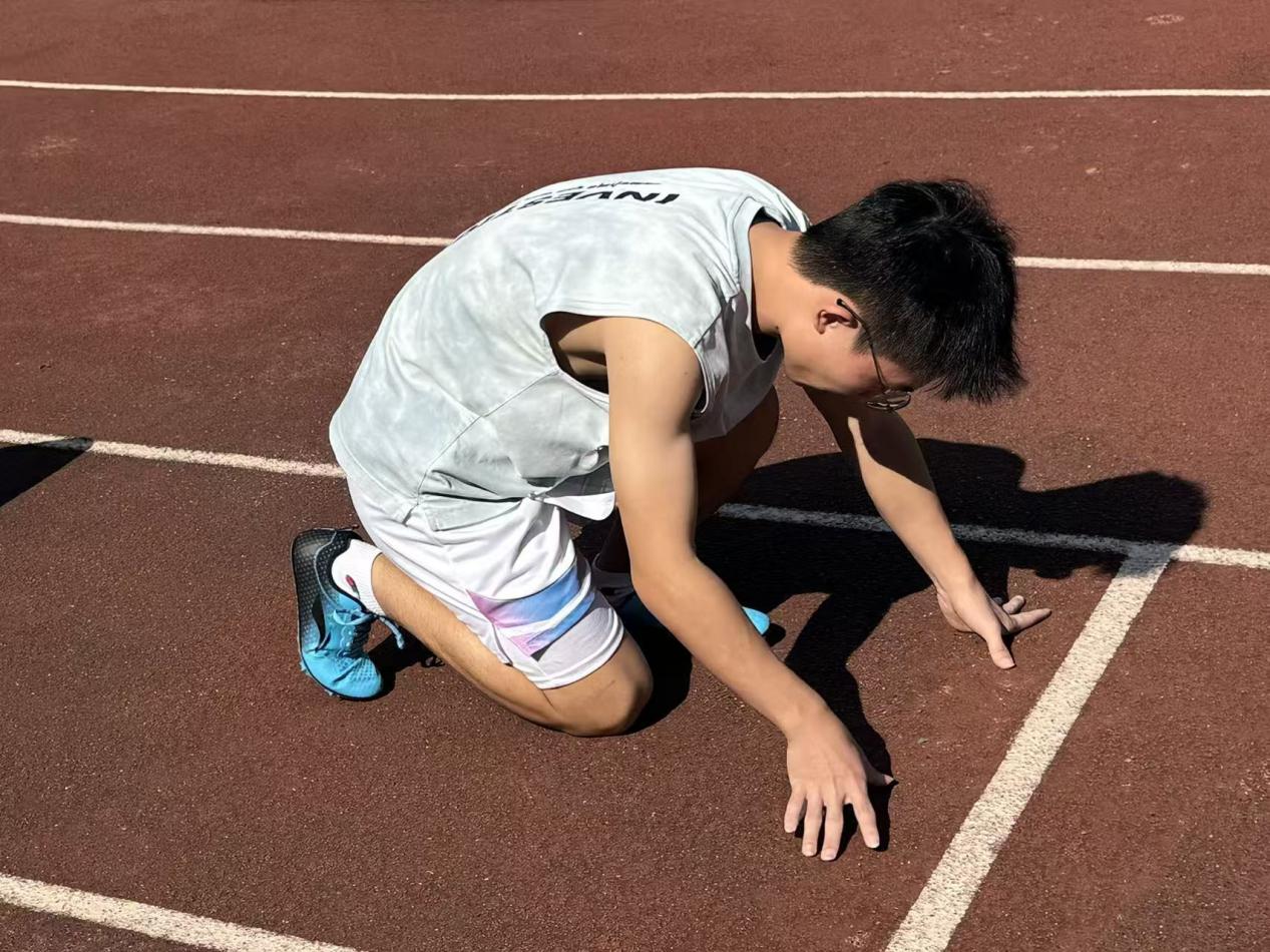决赛现场,气氛紧张到极致。起跑线上,邓言顺与其他七位选手并肩而立,他屈膝沉腰,双手撑地,目光如炬锁定终点,周身散发着势不可挡的锐气。“砰!”发令枪响震彻全场,他瞬间蹬地发力,如离弦之箭冲出起跑线,摆臂利落有力,步频稳健铿锵,每一步都踏在节奏之上,迅速抢占领先位置。