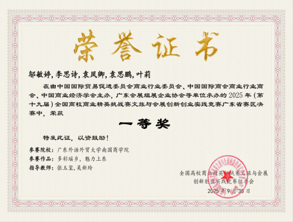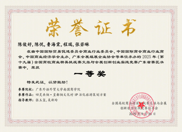 由22级邬敏婷(汉语言文学专业)担任队长,李思诗(朝鲜语专业)、叶莉(汉语言文学专业)、袁凤卿(英语师范专业)、袁思鹏(俄语专业)同学组成的“云岭瑶韵队”,聚焦惠州龙门上东村的旅游资源,完成了《多彩瑶乡,魅力上东》文旅策划方案,深入挖掘当地文化特色,提出创新性旅游发展路径,最终成功斩获全国一等奖。