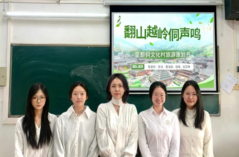 “云岭瑶韵队”队长邬敏婷表示“从组建团队到站上国赛舞台,老师带领着我们走过了一段充满挑战也充满收获的旅程。在策划惠州龙门上东村项目时我们深入调研当地资源,切实的将文化传承与旅游创新相结合。”她深刻领悟到,真正的领导力是让每个人发光发热。组员李思诗发挥小语种优势,查找国外乡村文旅案例,为项目定位提供重要参考,她坚信小语种不是边缘‘辅助’,而是能融会贯通的‘战略枢纽’。叶莉承担策划案核心内容撰写,她分享道:“‘河伯未见北海之前,谈天地辽阔是没有意义的’,这次比赛就是‘见到北海若’的经历,老师密切的指导与团队合作让我突破了认知边界。”袁凤卿负责PPT设计与新业态分析,感慨比赛让自己“跳出井口”,在协作中吸收他人所长,明白“意识到自身有限才能走向开阔”。袁思鹏参与部分章节撰写与PPT制作,他表示在团队耐心陪伴与老师指导鼓励下,于自律协作中不断成长。五人携手将上东村的瑶乡魅力融入策划,让这份文旅方案成为连接乡村与世界的纽带。