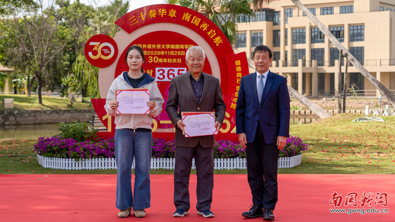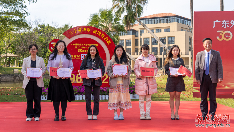 本网讯 2025年11月28日,广东外语外贸大学南国商学院30周年校庆倒计时一周年启动仪式在薪火草坪隆重举行。作为校庆系列活动首场重要文化活动的“稻浪·荷风”主题征文活动,其获奖名单在仪式上正式揭晓。我院多名师生凭借扎实的文字功底与深厚的情感表达荣登榜单,学院获奖代表在现场受到学校领导的表彰。