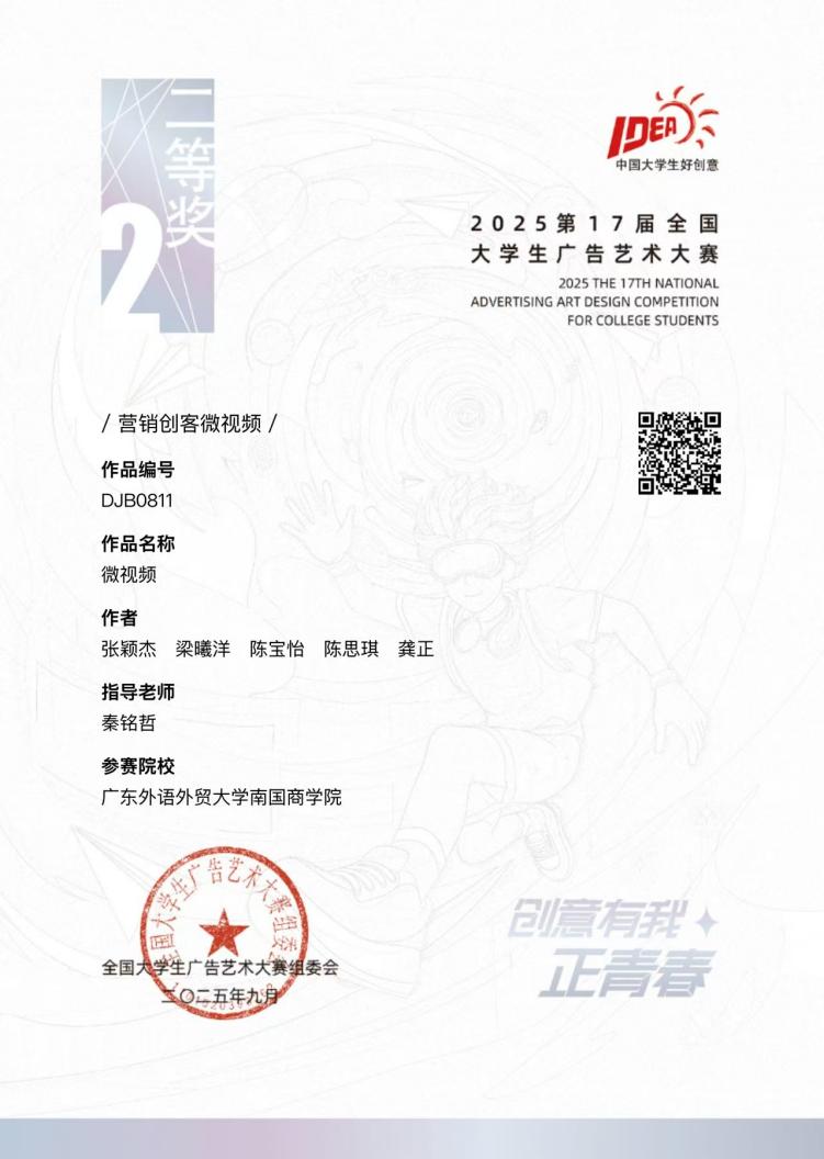 本网讯 近日,2025 年第 17 届全国大学生广告艺术大赛(简称 “大广赛”)获奖名单正式揭晓。我校文化与传播学院 2023 级播音与主持艺术(英文班)张颖杰、梁曦洋、陈宝怡、陈思琪、龚正五位同学组成的 团队,在竞争激烈的营销创客类微视频赛道脱颖而出,凭借优质作品荣获全国二等奖,为学院和学校赢得了荣誉。