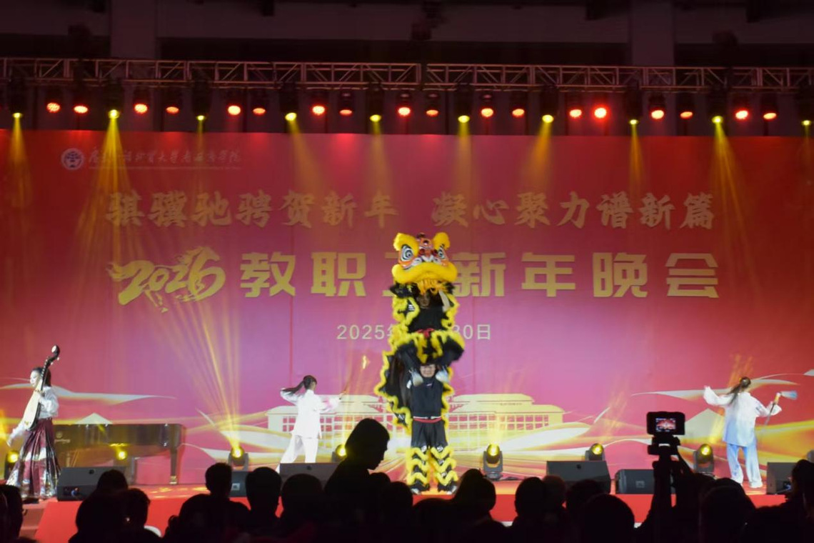 随着主持人的报幕,文化与传播学院师生带来了串烧节目《墨韵华裳承薪火,同心欢歌贺三十·迎元旦》。灯光渐暗,一头醒狮踩着铿锵的鼓点跃入舞台中央,金红相间的狮身流光溢彩,灵动的狮头时而昂首四顾,时而眨眼摆须,栩栩如生。前排学生手持舞剑,英气十足,弹奏琵琶的老师身着马面裙,走向舞台中间为舞狮奏乐。
