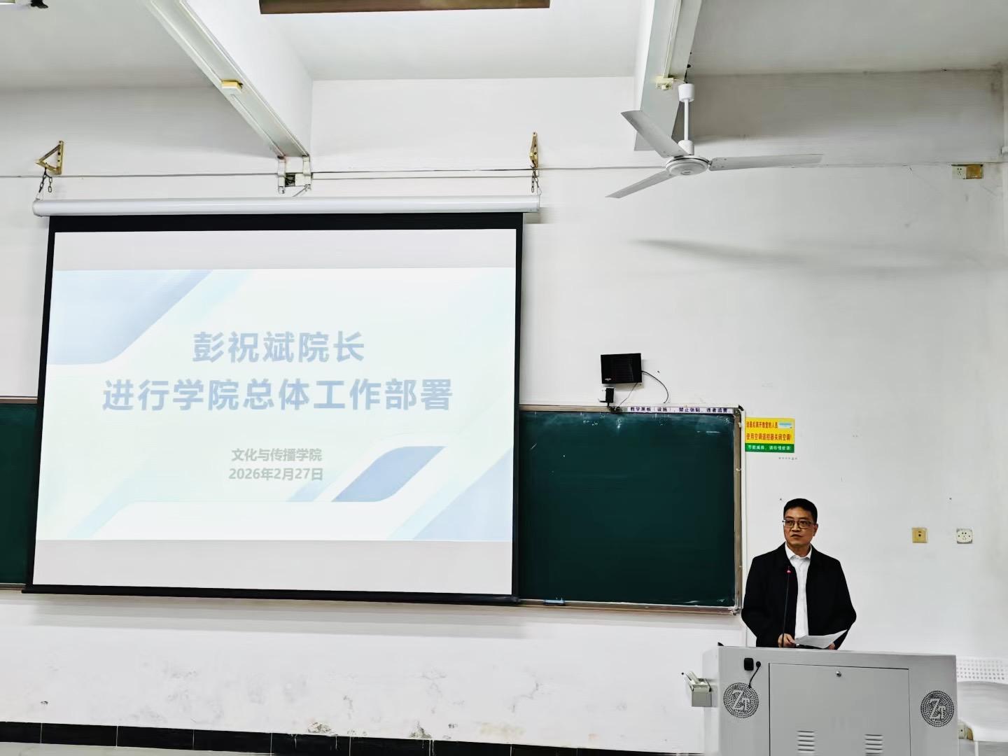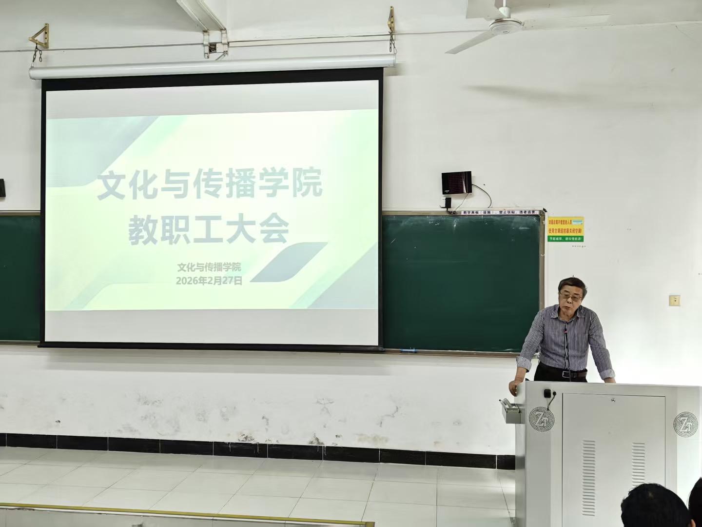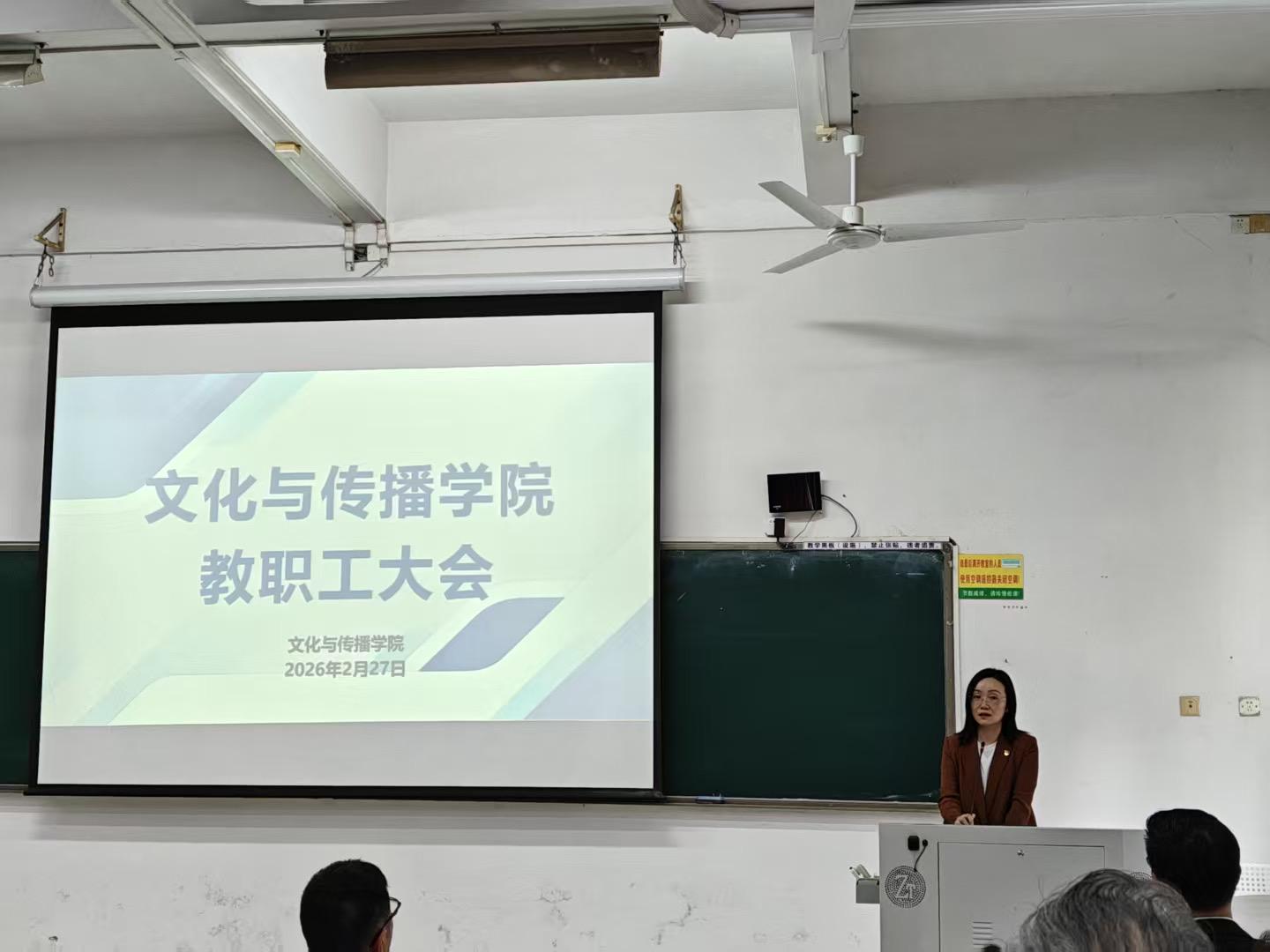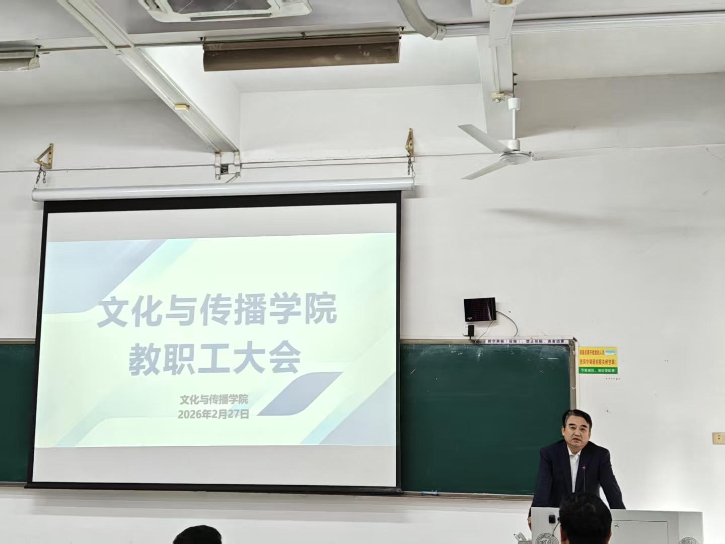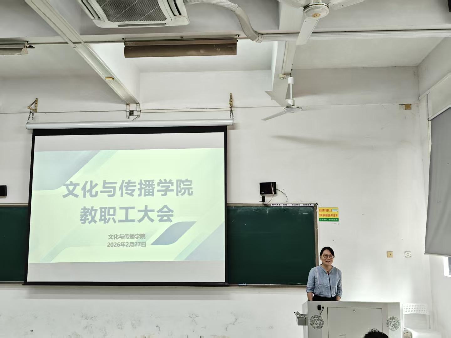 为统一思想、明确任务、凝聚学院发展合力,2026年2月27日下午3点,文化与传播学院于教学楼G103室召开干部任命宣读会议暨2026年第一次教职工大会。学院分管校领导、学院新一届领导班子及全体教职工参会,会议系统部署新学期各项重点工作,为学院高质量发展锚定方向、明晰路径。