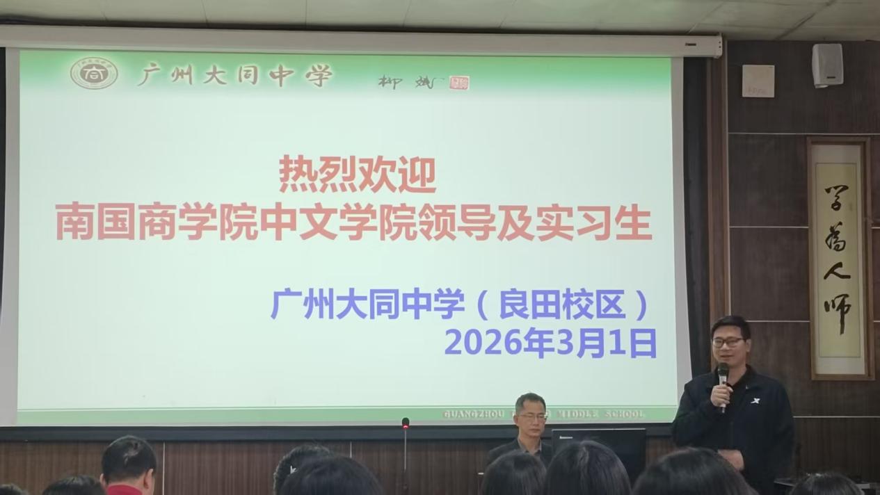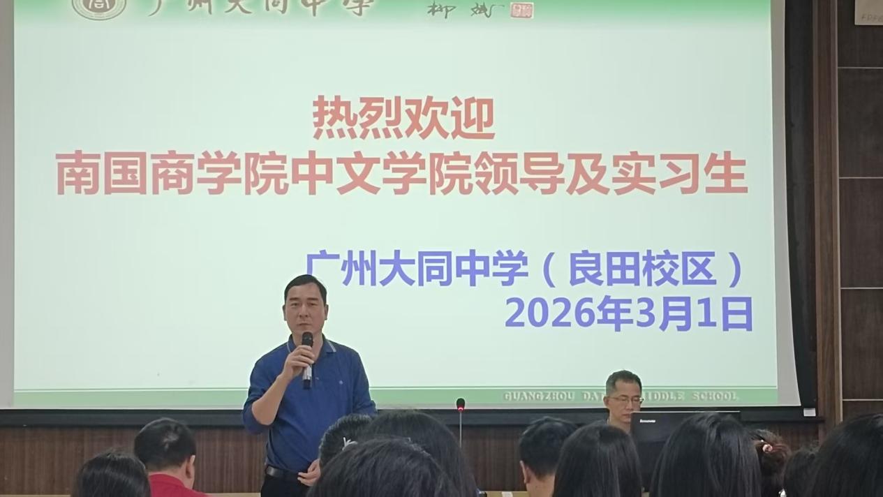本网讯 为进一步深化产教融合,扎实推进实践教学工作,夯实学生就业基础,2026年3月1日至3月2日,文化与传播学院组织2022级汉语言文学专业19名实习生,分批次前往广州大同中学初中部,正式开启为期8周的教育实习之旅。学院党总支书记冯钿、辅导员乔旖旭带队走访,广州大同中学初中部冯剑雄主任及相关领导予以热情接待,两校携手搭建起理论与实践深度融合的师范生成长平台,助力实习生锤炼教学本领、衔接职场发展。