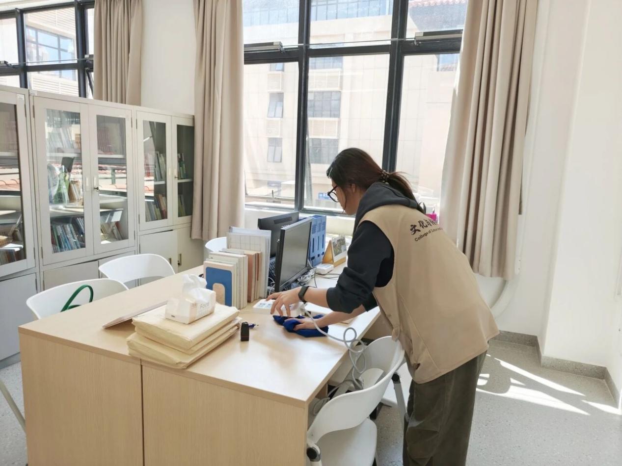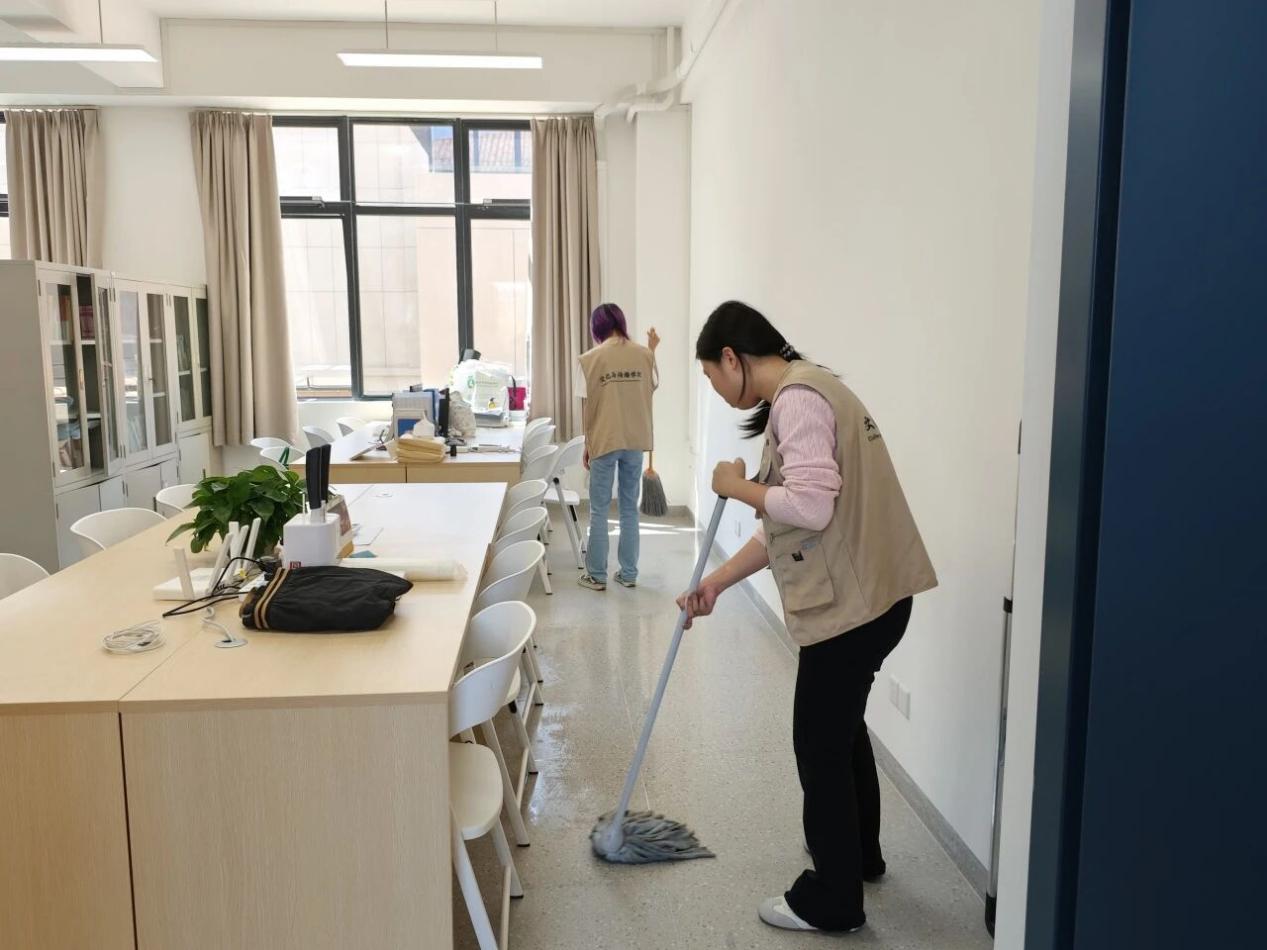 活动中,校内组同学手持清洁工具穿梭于教师办公室与文教楼周边,擦拭桌椅、清理窗台、分类垃圾,连角落的纸屑也不放过,让教学区域焕然一新。当阳光毫无保留地穿过明净的玻璃,洒满书桌,我们仿佛听见了自然的呼吸,也看见了心中那份对绿色未来的承诺,在劳动的汗水中生根发芽,熠熠生辉。此次活动不仅是一次劳动实践,更是一堂生动的“行走思政课”。