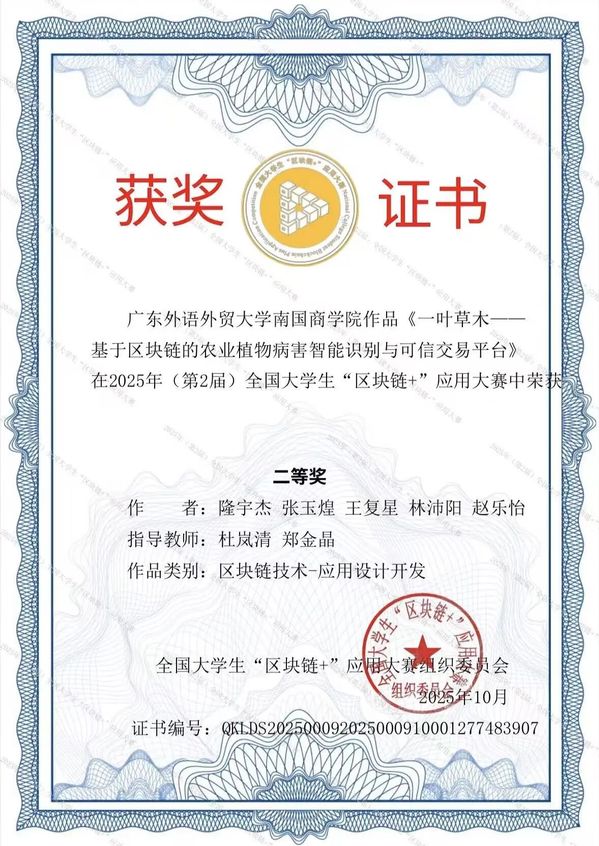 近日,2025年(第2届)全国大学生“区块链+”应用大赛全国总决赛圆满落幕,经过激烈角逐,广东外语外贸大学南国商学院计算机学院杜岚清、郑金晶老师指导,隆宇杰、张玉煌、王复星、林沛阳、赵乐怡同学的作品《基于区块链的农业植物病害智能识别与可信交易平台》夺得区块链技术-应用设计开发赛道二等奖。
