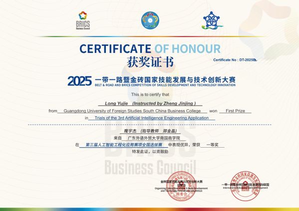 在我校计算机学院郑金晶老师的指导下,隆宇杰同学凭借卓越的专业技能与创新应用能力勇夺省赛一等奖。