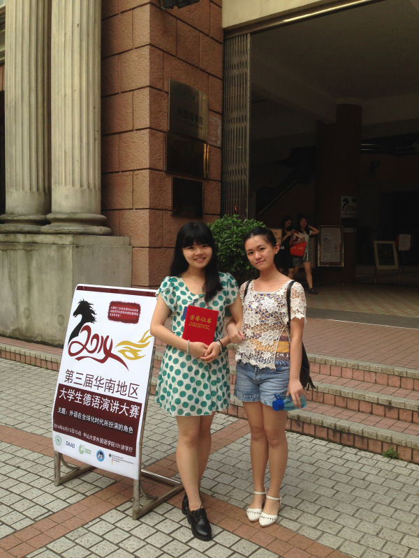 周悦:2014年获第三届华南地区大学生德语演讲比赛一等奖,2015年获歌德学院奖学金赴德国参加暑期德语班,目前在德国汉堡大学攻读博士学位,师从Imo Wolfgang与Susanne Günthner,方向为德语互动构式语法。