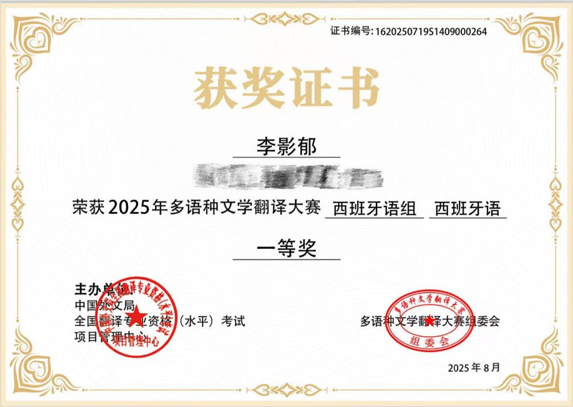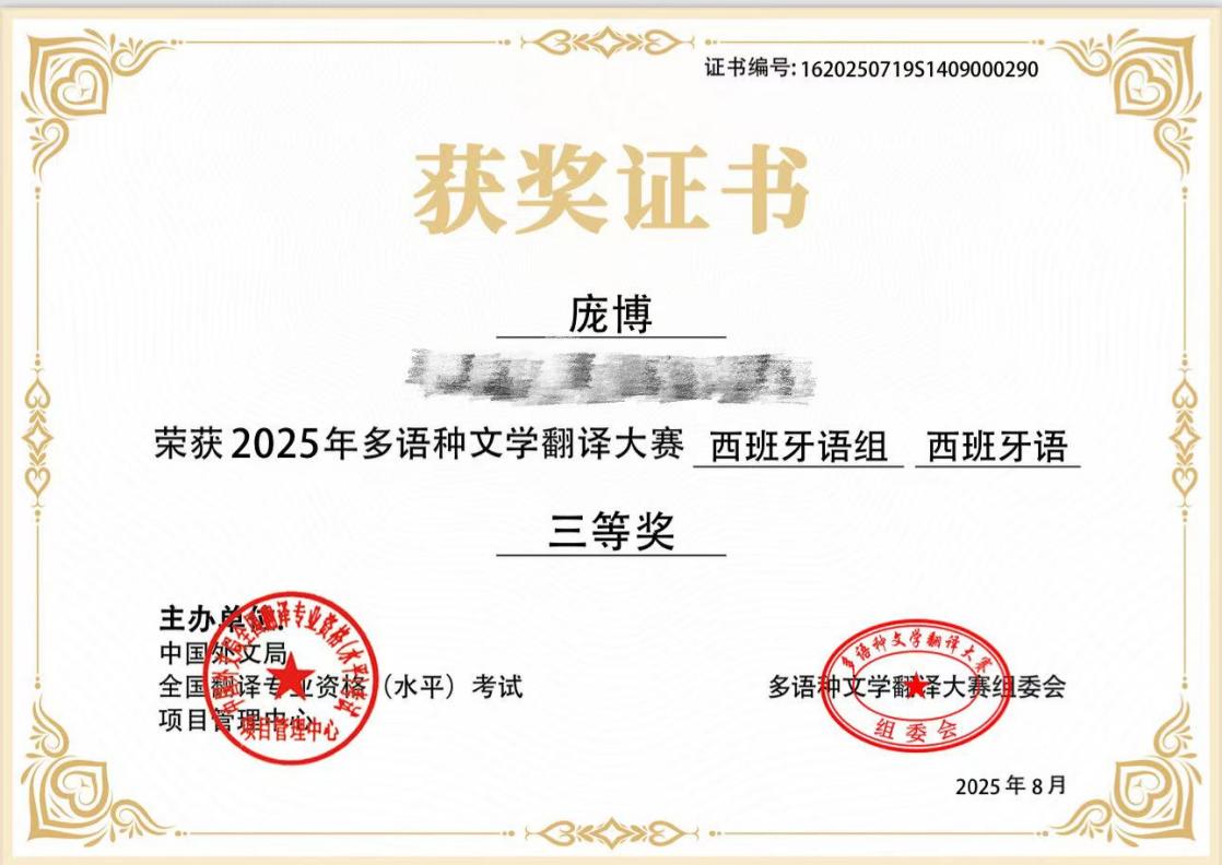由中国外文局CATTI项目管理中心主办的2025年多语种文学翻译大赛评选结果,于8月5日正式揭晓。我院西班牙语专任教师李影郁、庞博凭借扎实的专业功底、深厚的文学素养与出色的翻译能力,在大赛激烈角逐中脱颖而出,分别荣获西语组一等奖和三等奖。这一成绩充分展现了我院西班牙语专业教师过硬的业务能力与良好的专业风采,更是我院长期坚持“以赛促教、以赛促研”教学理念的又一硕果。