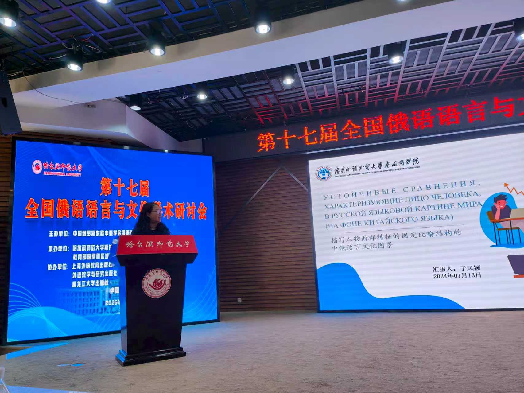 2025年7月11日至13日,由中国俄罗斯东欧中亚学会俄语教学研究分会主办,哈尔滨师范大学斯拉夫语学院及教育部国别和区域研究中心“哈尔滨师范大学斯拉夫国别研究中心”承办,上海外语教育出版社及黑龙江大学出版社协办的“第十七届全国俄语语言与文化学术研讨会”在哈尔滨成功召开。本届大会以“多元视角下俄语语言与文化研究的新生态与新发展”为主题,汇聚了全国俄语学界的众多知名专家学者。广东外语外贸大学南国商学院西方语言文化学院院长于凤颖副教授 应邀出席大会,并作主旨演讲。