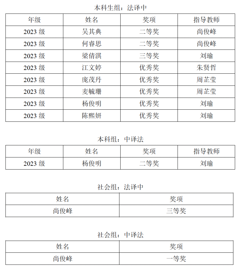 我校法语系历来重视学生的专业学习与实践,始终鼓励学生参与校内外各级各类比赛。自比赛公告以来,法语系积极动员学生参与报名,共计8名学生参加,其中1名教师带头参加。在参赛学生的认真准备和专业教师的严格指导下,所有参赛选手均取得优异成绩,同时积累了笔译实战经验,正如何睿思同学所言:“经历此次翻译,才深刻体会到好的翻译是不断修改打磨的。”